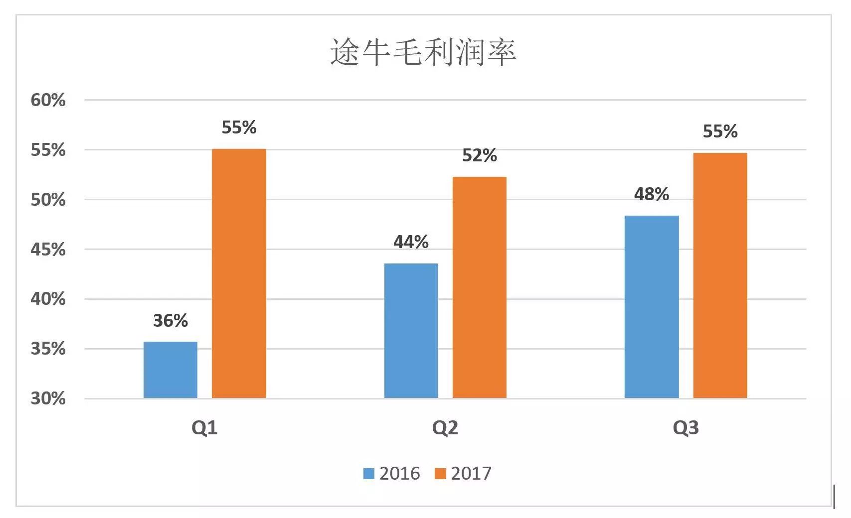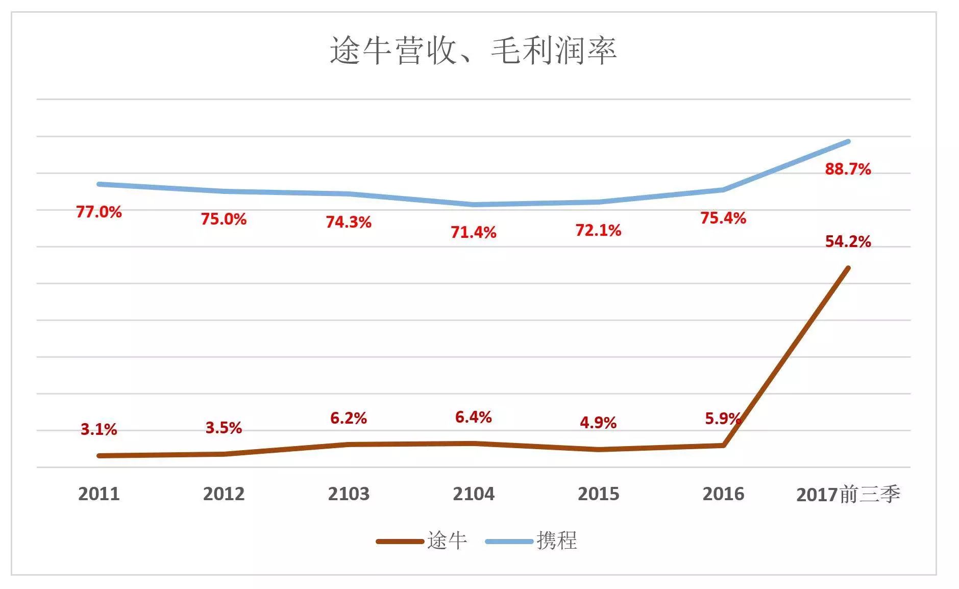 进入2017年,途牛按新规则确认营收,前三季度数据毛利润率为54.3%,远远低于携程。