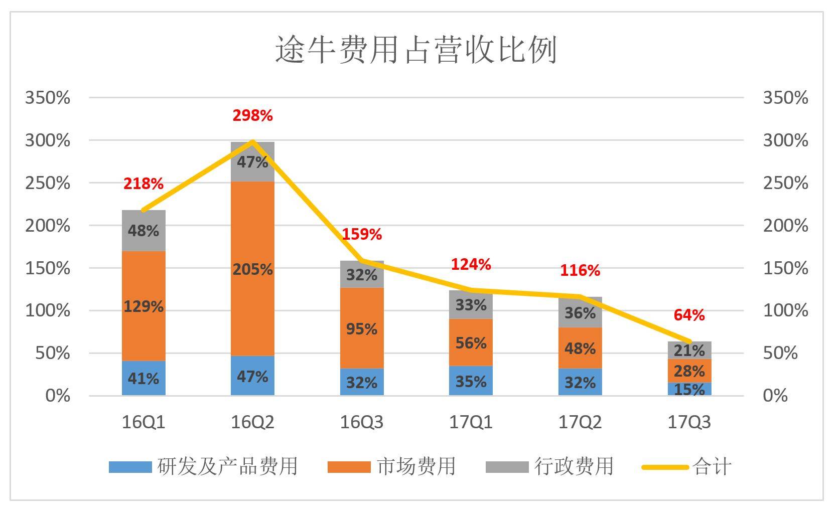 2017年Q3,途牛三项费用合计占营收的64%,2016年同期为159%,2016年Q2竟然达到298%。
