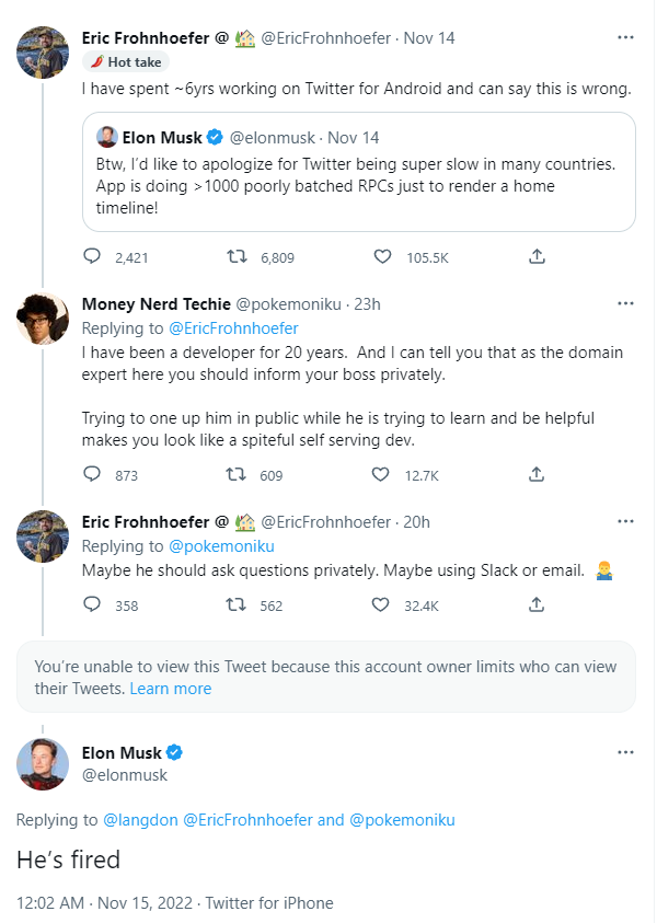 最近马斯克推特上为 Twitter 在许多国家运行速度慢道歉,表示该问题的起因是加载主页时间线进行了 1000 多次“糟糕的分批”远程过程调用(RPC)。Twitter 员工 Frohnhoefer 在推文下回复称,他有六年 Twitter 安卓版开发经历,Twitter 实际上没有进行远程程序调用。为此两人展开了漫长的对线,有网友表示 Frohnhoefer 或许该私下告知老板,但 Frohnhoefer 则认为老板应该先私下联系员工。最终,马斯克在回复中表示,该员工已被解雇。对这场老板和员工公开对线,你有什么看法呢?