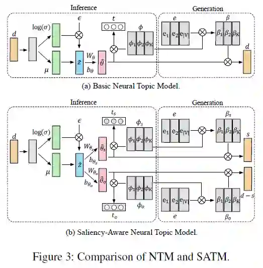 论文则改进了神经主题模型,如上图(b)所示,使其能区分有价值主题和无意义主题。上面那条通路是去重构参考摘要中的词 s,对应有价值主题;下面的通路是去重构对话内容中除开参考摘要的词 d-s,对应无意义主题。这也使得改进后的神经主题模型变成了一个有监督的学习过程。