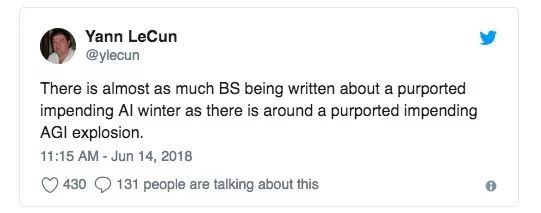 虽然深度学习火了,这对机器学习来说却不是什么好事。为了避免深度学习被误认为是import keras就能解决一切的技术,第一批推广深度学习的机器学习研究人员一直在淡化现代神经网络的作用,而这种矫枉过正已经开始对学界的发展和未来造成不良影响——人们开始把它看成空中花园,讨论起寒冬即将来临,人工智能研究将陷入停滞。