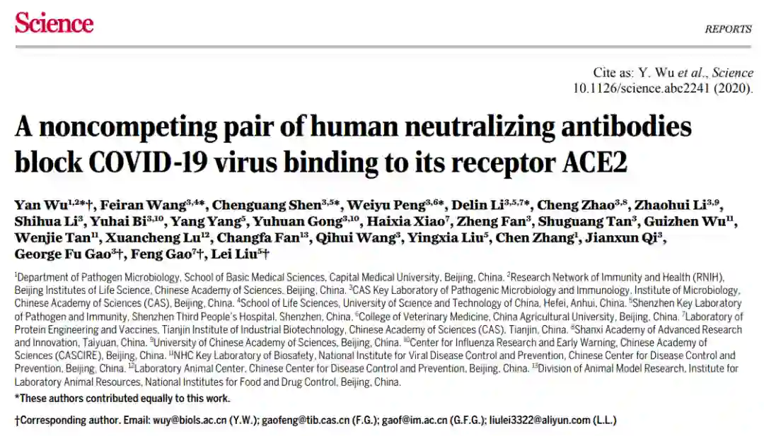 高福院士发表Science论文!从康复患者体内发现2种抗体,可阻断新冠病毒与ACE2结合,为疫苗设计提供结构基础