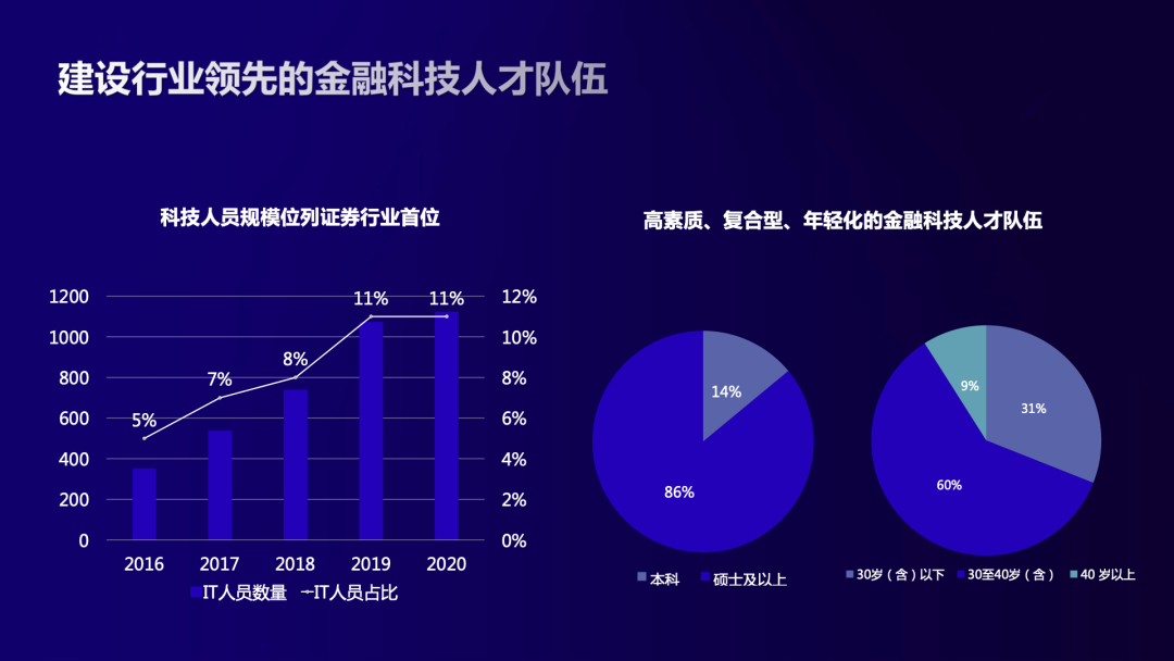 2020 年底集团信息技术人员近 1200 人,占总员工数约 11%。公司科技人员规模位列证券行业首位。硕士及以上学历占比近九成,是一支高素质、复合型人才队伍。