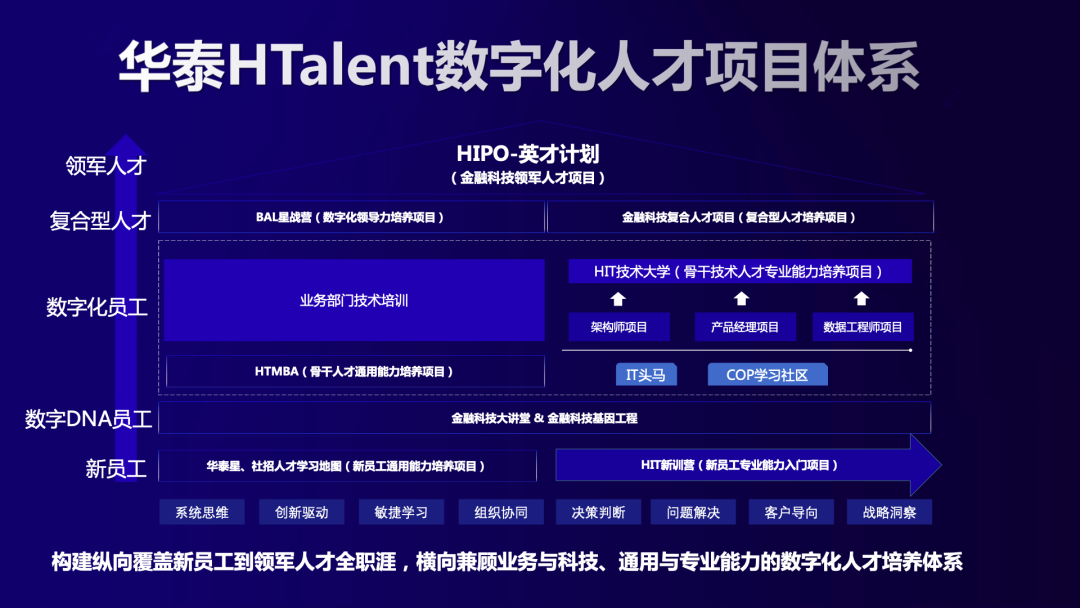 基于这些痛点,华泰开始不断探索打造基于自身特色的数字化人才体系。建立了包含金融科技领军人才、复合型人才、数字化员工、数字化 DNA 员工四个层级的数字化人才体系,制定各层级基于痛点和需求的培训项目。