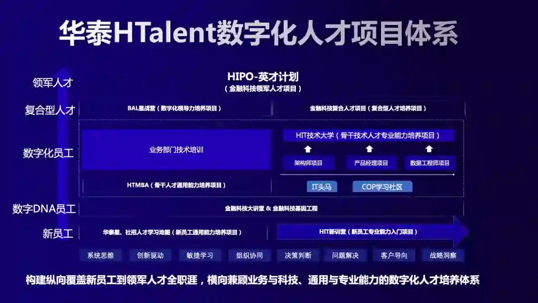 刚才界定了数字化人才的四个层级,接下来介绍一下华泰面向这四层人才的培养体系。我们根据人群和承担的数字化转型职能,设计了一套独特的培养项目。