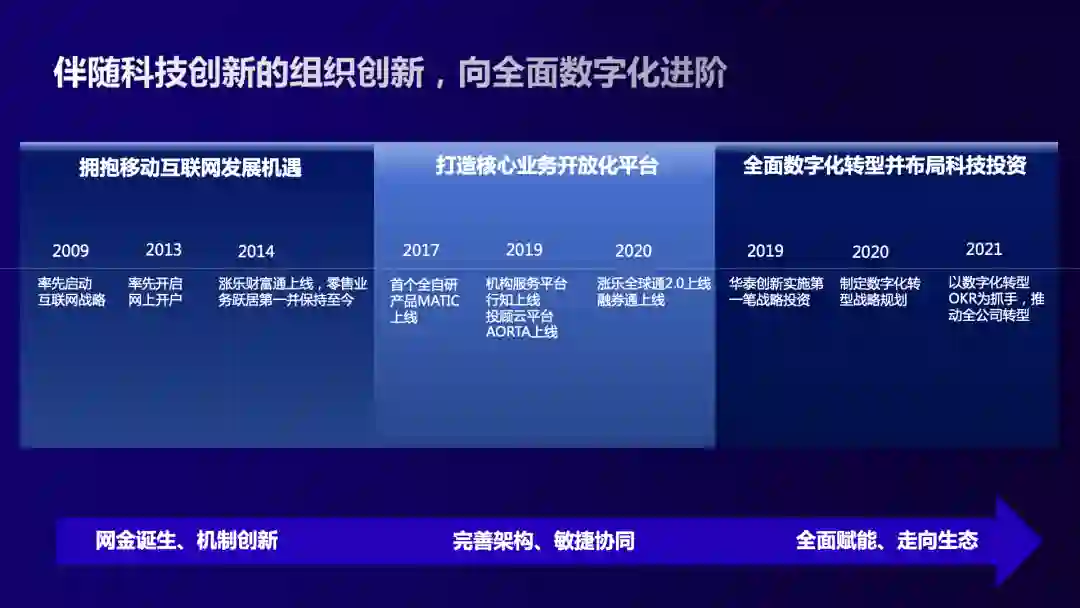 接下来我来介绍下华泰的科技转型路径。可以看到,华泰 10 年的科技创新之路,既是业务的创新之路,也是组织的创新之路。