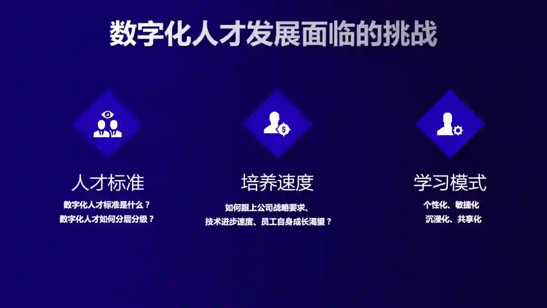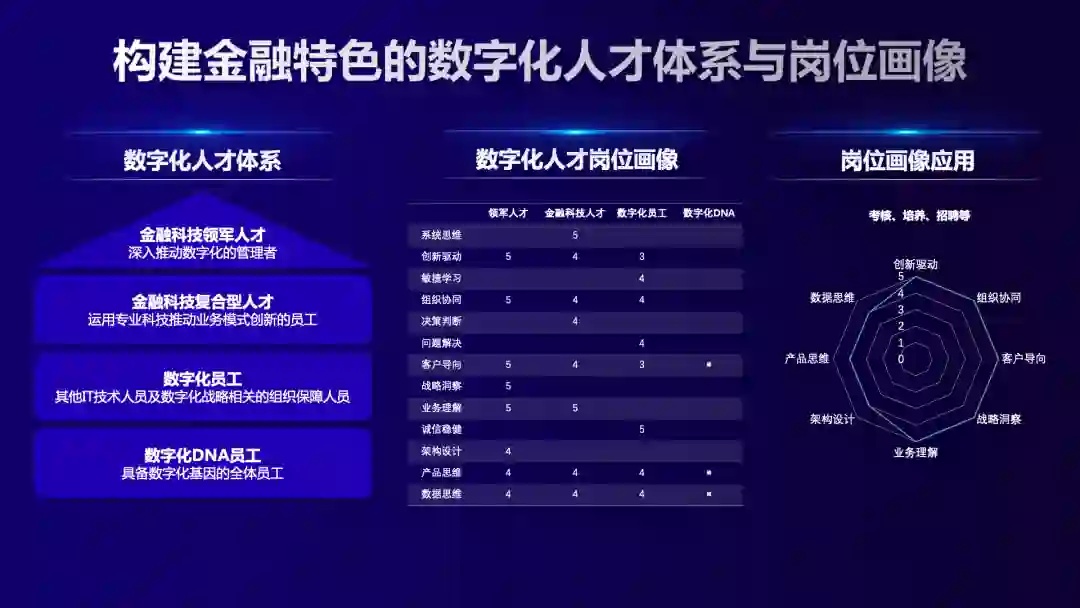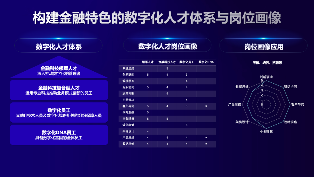 第一,关于人才标准,金融行业数字化人才的特征,跟传统金融行业不一样,跟互联网公司也不一样,这就需要基于现在或未来的数字化转型目标,把人才进行细化的理解和描述。