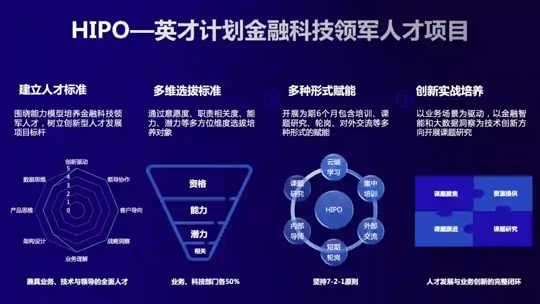 这类人才在外部寻找是非常困难的,在这个背景下,我们前几年推进了领军人才项目。围绕公司战略出发,从业务部门挑选有科技背景,在组织架构中对数字化转型有重要影响的角色;在科技部门理解业务数字化转型急迫性,对数字化转型落地有重要作用的角色。