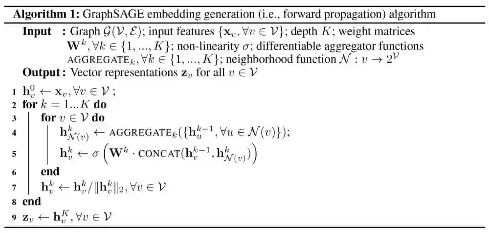 GraphSage提供了解决上述问题的解决方案,它以归纳方式学习每个节点的嵌入。 具体来讲,它将每个节点用其邻域的聚合重新表示。 因此,即使在训练时间期间未出现在图中新节点,也仍然可以由其相邻节点正确地表示。 下图展示了GraphSage的算法过程。
