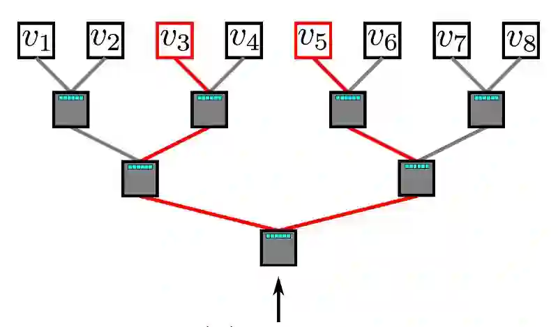 多层的softmax利用二叉树来解决softmax计算成本问题。 在二叉树中,所有叶子节点(上面所说的图中的v1,v2,... v8)都是图中的顶点。 在每个内部节点中(除了叶子节点以外的节点,也就是分枝结点),都通过一个二元分类器来决定路径的选取。 为了计算某个顶点v_k的概率,可以简单地计算沿着从根节点到叶子节点v_k的路径中的每个子路径的概率。 由于每个节点的孩子节点的概率和为1,因此在多层softmax中,所有顶点的概率之和等于1的特性仍然能够保持。如果n是叶子的数量,二叉树的最长路径由O(log(n))限定,因此,元素的计算时间复杂度将减少到O(log | V |)。