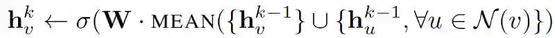 外层for循环表示更新迭代次数,而 h^k_v 表示节点v 在迭代第 k 次时的本征向量。 在每次迭代时,将通过聚合函数,前一次迭代中 v 和 v 领域的本征向量以及权重矩阵W^k 来更新h^k_v 。这篇论文提出了三种聚合函数:
