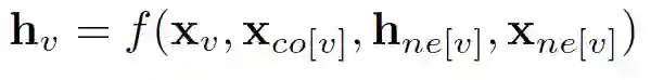 x_co[v] 代表连接顶点v的边的特征,h_ne[v]代表顶点v的邻居节点的嵌入表示,x_ne[v]代表顶点v的邻居节点特征。f是将输入投影到d维空间的转移函数。由于要求出h_v的唯一解,我们应用Banach不动点理论重写上述方程进行迭代更新。