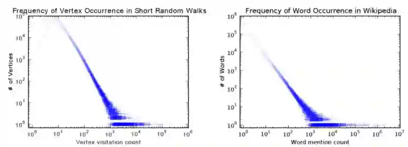 DeepWalk是第一个以无监督学习的节点嵌入算法。 它在训练过程中类似于词嵌入。 它的初衷是图中的两个节点分布和语料库中的单词分布都遵循幂律,如下图所示: