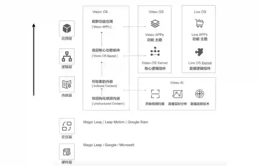 而这些视频内的广告类型还可以做灵活组合与运行,其靠的是一个特别的轻量级视频操作系统。一般的操作系统有四层,硬件层、交互层,然后到逻辑层、应用层,视频操作系统在交互层后多了一个内容层。在内容层上,首先要通过人工智能技术把视频中的人脸、物体等非结构化数据结构化,分析出人物、地点、品牌、动作等等不同的维度。接着是逻辑层,通过不同的组件,比如说直播、点播等等,组成相关的应用。最后到顶层,应用层,这一层有不同的功能和主题,以及互动应用。