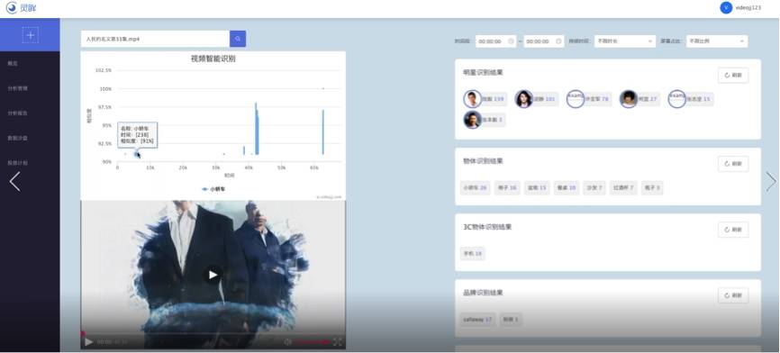 Video AI 是 Video++推出的视频自动识别+投放系统。该系统会首先识别出视频中的人物(明星)、物体(手机、电脑等)等等,然后给出一些列标签报告,客户可以查看这些明星、手机出现的点位。这些点位以坐标轴的方式呈现,横坐标是时间,纵坐标是相似度。接下来是广告投放。比如一个化妆品广告主,想投所有跟女性相关的场景,就可以选择所有跟女性相关的关键词,然后系统就会给出相应的点位,来投放广告。比如说某个视频场景中有情侣在亲吻,就有杜蕾斯的自然呈现,如果视频中出现了阳光和沙滩,就推防晒霜的广告,这种情况下观众不觉得违和。