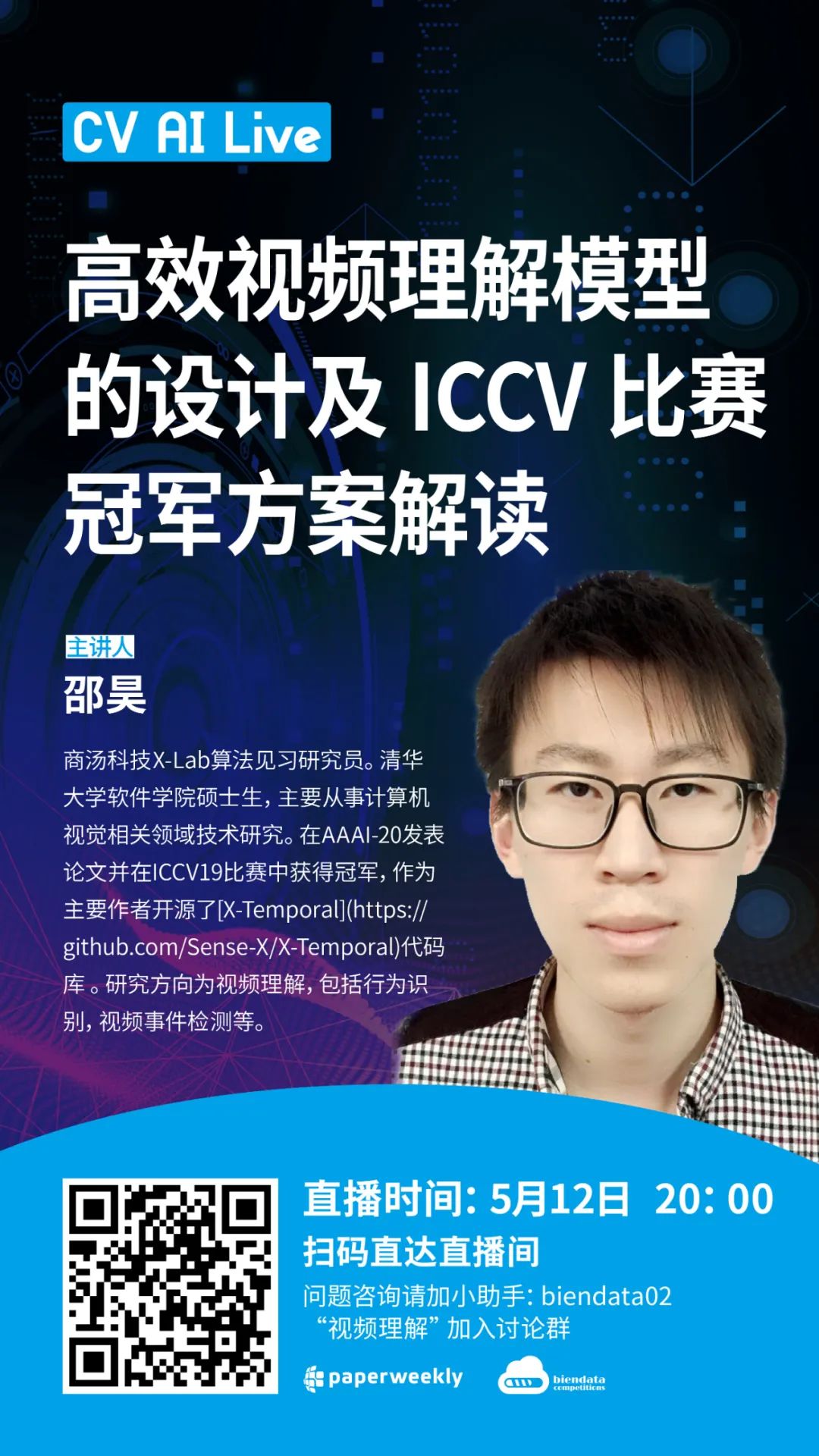 本期 PW Live,我们邀请到商汤科技 X-Lab 算法见习研究员邵昊,为大家带来高效视频理解模型的设计及 ICCV 比赛冠军方案解读的主题分享。