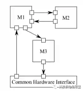 图5是该架构的的功能视角。图中给出一个应用程序的示例,包括3个模块M1、M2和M3。每个模块是一个可执行的、以容器图像形式出现的软件,模块间用它们的元数据进行组合。在元数据中包括输入和输出定义(图中用小的方块表示),以及有关被传输或接收的消息的类型信息。输入和输出以兼容的类型连接,公共硬件接口被用做一种元模型,为各种不同的硬件提供一般的输入和输出。