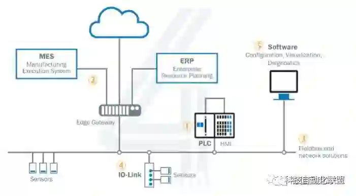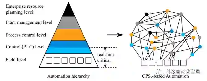 图示左面揭示了生产系统的多层递阶逻辑结构,右面则反映了随着工业4.0和智能制造的发展,这些不同功能的软件之间的通信关系以及数据流动的关系,不再遵循多级递阶的方式而趋于扁平化,以求得快速协同直接交换数据。于是构成基于CPS的工业生产自动化系统。