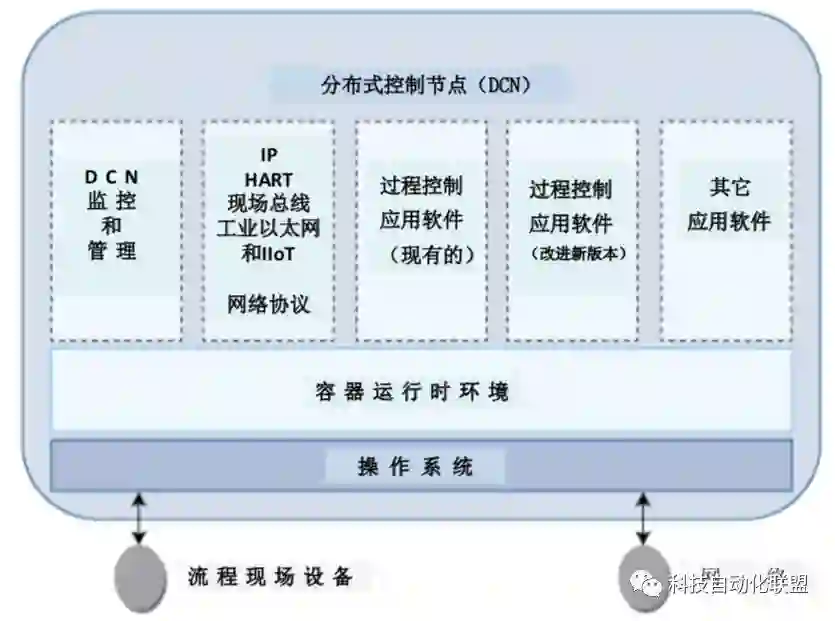 (1)由埃克森美孚倡导的开放式流程自动化OPA,是针对现有的DCS和PLC系统不能适应未来的OT/IT深度融合的要求而提出的标准化活动。活动聚焦于如何运用最新的分布式云计算技术和虚拟化技术,重新定义已经日趋陈旧、20多年没有变动的架构,重新定义DCS和PLC,以及与优化运营密切相关的先进控制和MES。图4表示如何将容器技术运用于OPAF的架构,构成一个分布式控制节点(DCN)。根据实际的需要,可以在一个DCN容器中容纳所需要的各种APP,如监控和管理DCN的APP、现场总线和工业以太网的APP、现有的过程控制算法APP、新开发的过程控制算法APP等等。