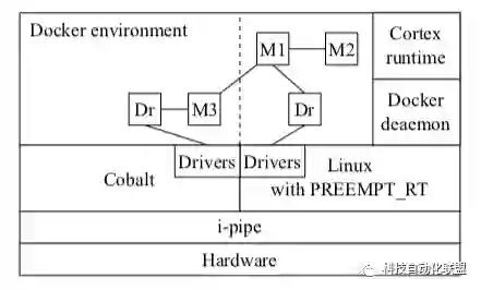 图6则是以系统视角来描述该架构。在整个架构中Linux核有两个补丁,即PREEMPT_RT 补丁与Cobalt 核补丁。这使得在同一时间内可在这两个核中运行不同的模块,由它们的判据决定哪些模块在PREEMPT_RT 补丁运行,哪些模块在Cobalt核运行。也有可能仅运用这两个核中的一个。在两个核中都要安装驱动,使得模块可以运行在相应的核上。所有的模块均分布在Docker容器中,并由Docker的后台程序(daemon)管理。模块间的互动通过映射在容器中的设备文件驱动。