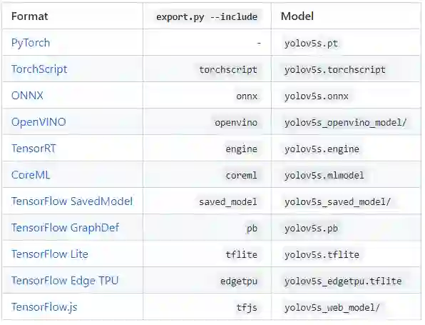 Export Benchmarks:使用python utils/ Benchmark.py导出所有YOLOv5格式(mAP和速度)。目前在CPU上运行,未来的更新将实现GPU支持。