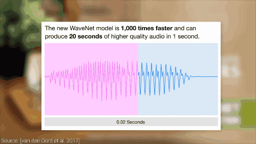 在旧的 WaveNet 算法情况下,程序员必须为每一秒连续声音片段,生成 24000 个样本。而且,这些新样本是一个一个生成的,让一个计算单元完成所有的工作,意味着同一时间内,其它的计算单元什么都不做,并不适合如今所需的大规模计算,也很难在实时生产环境中部署。