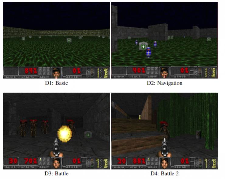 图2:展示了来自于四个场景的样例。D1展示了在一个正方形房间里收集医疗包(“Basic”)。D2展示了在迷宫中收集医疗包并且还要避开毒药(“Navigation”)。D3展示了在迷宫中收集医疗包和弹药并同时攻击敌人(“Battle”)。D4展示了在一个更加复杂的迷宫中收集医疗包和弹药并同时攻击敌人(“Battle 2”)。
