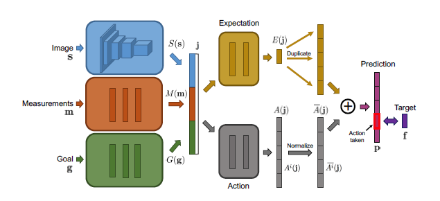 图1:网络结构。s表示图像数据,m表示测量,g表示目标。s,m,g首先通过三个输入模块分别进行处理。然后这些输入模块的输出结果将被连接成一个联合表示j。之后联合表示j被送入了两个并行的计算流进行单独处理,这两个计算流分别用于预测测量期望E(j)和归一化动作条件差异。最后两个计算流的输出将被组合到一起以获得针对每个动作的最终预测。