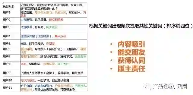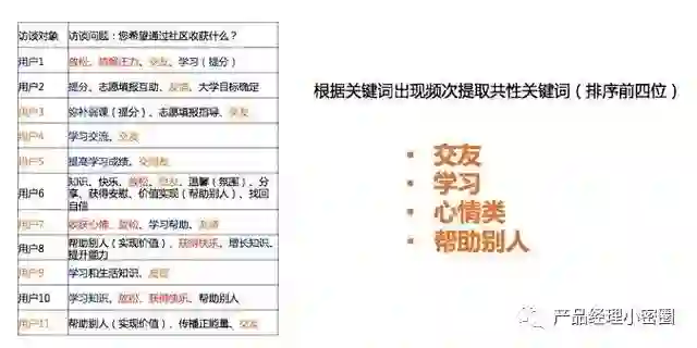 在访谈结果分析方面,一般采取关键词提炼法,即针对每个用户对每个问题的反馈进行关键词提炼,然后对所有访谈对象反馈出的共性关键词进行汇总,具体思路如下: