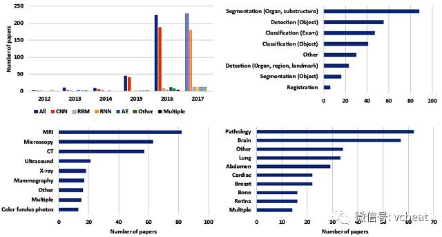 对于整个医学来讲,图片是应用最主要的领域。深度学习在整个图像领域的应用包含图像的分类和图像的检测,这两方面在深度学习出现之后取得了非常大的进步。像VOC比赛,从原来非常差的成绩提升到非常高的水准,这使其在各个领域的应用都成为可能。