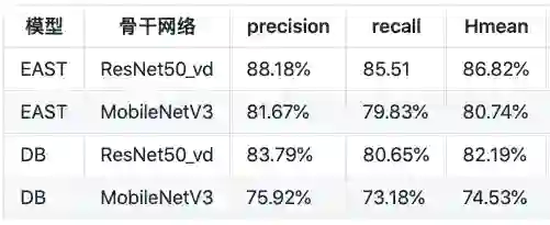 。文本检测算法部分,实现了EAST[1]和DB[2]。在ICDAR2015文本检测公开数据集上,算法效果如下: