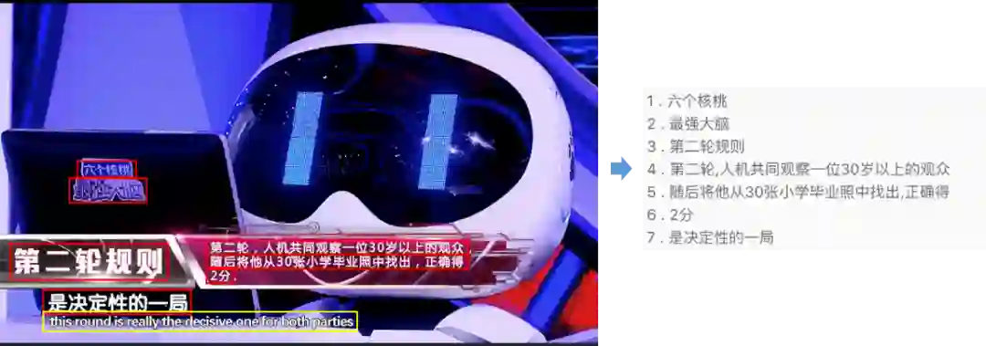 OCR技术有着丰富的应用场景,包括已经在日常生活中广泛应用的面向垂类的结构化文本识别,如车牌识别、银行卡信息识别、身份证信息识别、火车票信息识别等等,此外,通用OCR技术也有广泛的应用,如在视频场景中,经常使用OCR技术进行字幕自动翻译、内容安全监控等等,或者与视觉特征相结合,完成视频理解、视频搜索等任务。
