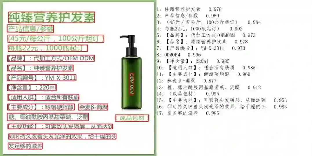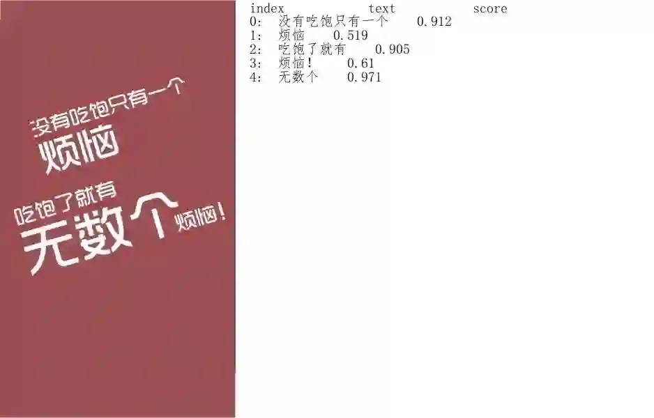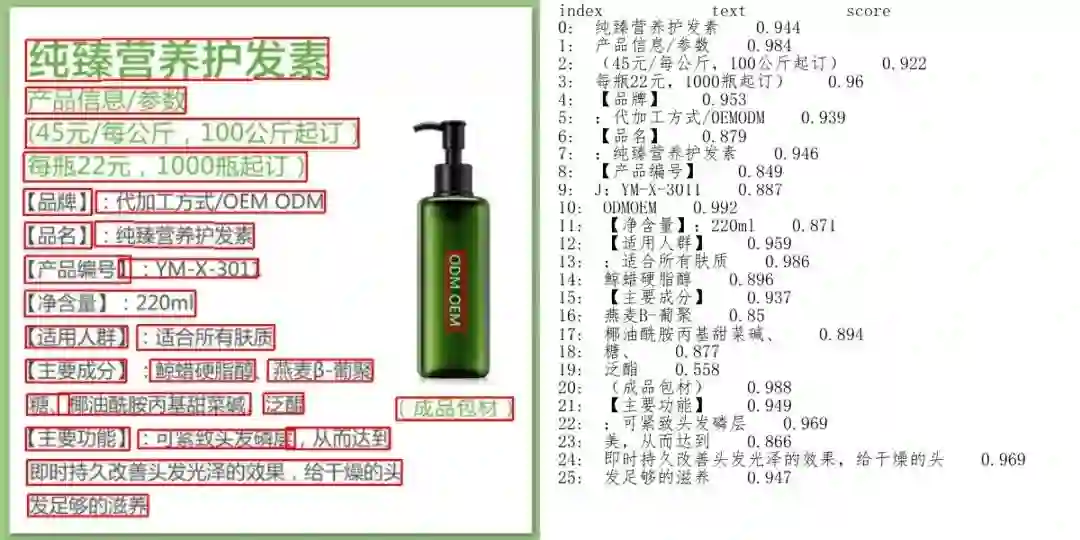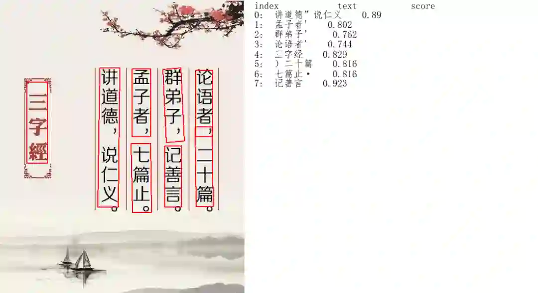 PaddleOCR超轻量模型同时支持中英文识别,并且支持倾斜、竖排等多种方向的文字识别,我们看看效果示例。示例图中给出了每个文本检测框的识别结果(text)和相应的置信度(score)。
