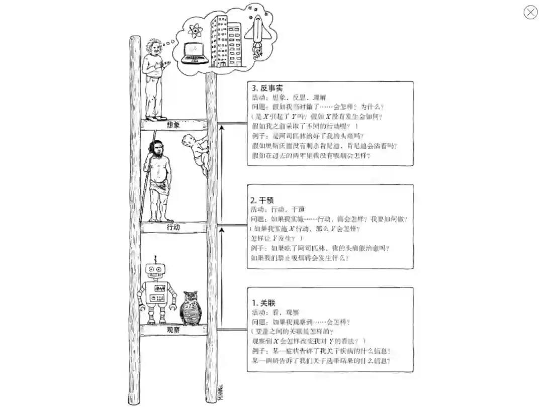 Judea Pearl 的这部著作,核心围绕“因果关系之梯”的三个层级来描述,他说:“我在机器学习方面的研究经历告诉我,因果关系的学习者必须熟练掌握至少三种不同层级的认知能力:观察能力(Seeing)、行动能力(Doing)和想象能力(Imagining)。”