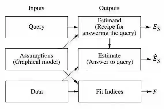 如图8所示,SCM引擎接受三种输入:假设(Assumptions)、查询(Queries)和数据(Data),并生成三种输出:被估量(Estimand)、估计值(Estimate)和拟合指数(fit indices)。被估量(E_S)是一个数学公式,该公式基于假设,提供从任意假设数据中回答查询的方法(可获取假设数据的情况下)。在接收到数据后,该引擎使用被估量来生成问题的实际估计值 E_s hat,以及问题置信度的统计估计值(以反映数据集的有限规模,以及可能的衡量误差或缺失数据)。最后,该引擎生成一个“拟合指数”列表,可衡量数据与模型传递的假设的兼容性。