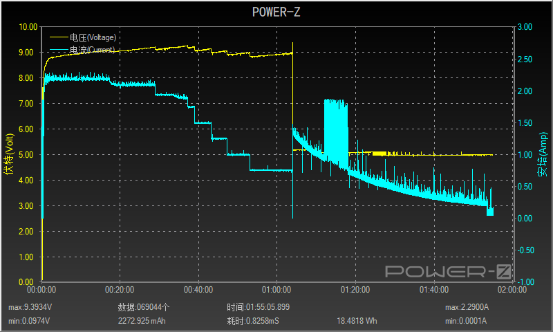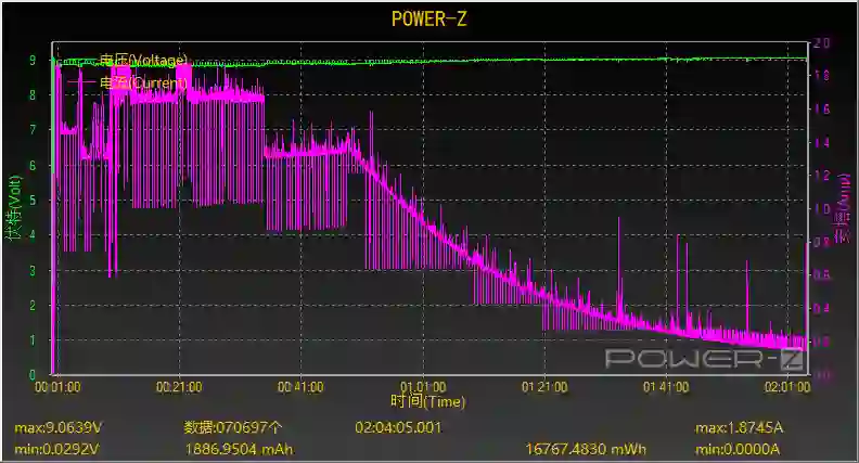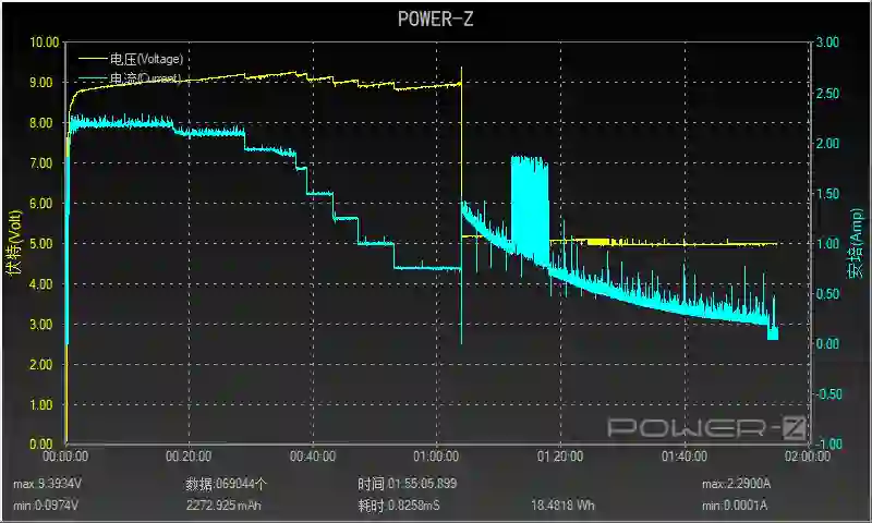 好了,前置的东西说完,就该进正题了,首先,给定容量的移动电源,到底能输出多少能量呢?我们测试了两款热门产品,以 9V2A 的规格从满电放到没电,结果如下。