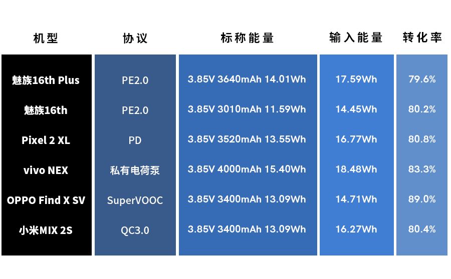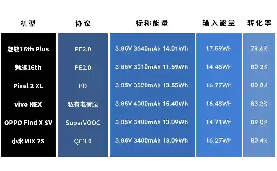 测试数据基本包含了目前各种快充形式的代表,包括传统高压、QC3.0 和低压大电流(电荷泵),结果上看,转化率都在 80% 左右,除了 NEX 和 Find X 比较高,考虑到这二位是私有协议,对于移动电源而言要么没得选要么垄断,所以无视掉,把 80% 认为是手机普遍的能量转化率系数,应该没有问题。