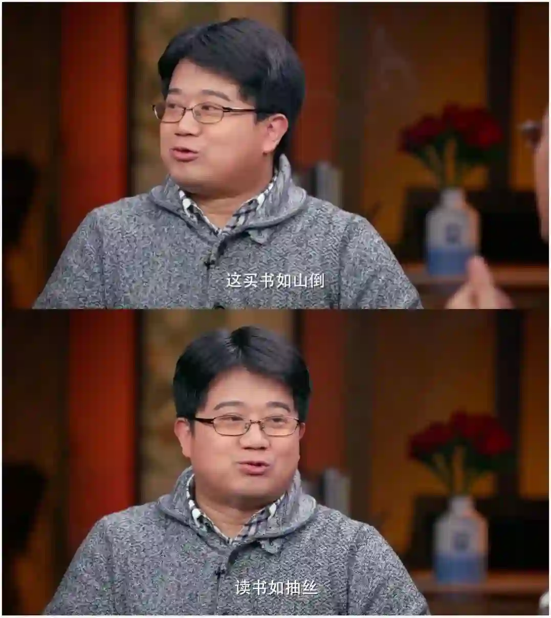 这个话当然是有道理的。不过,窦文涛问马伯庸和史航现在怎么吸收知识之后,我发现,原来他们也一样,很难沉下来吃透一本书。马伯庸说,和诸葛亮读书法一样,观其大略,现在已经没有时间去真的是一本书细细地一页一页抠了,大概翻一遍,大概知道里面讲什么东西,放回到书架上去。史航则说,他二手知识来源很多,比如看微博,看别人文章。