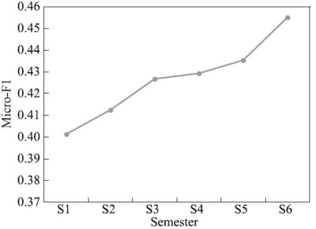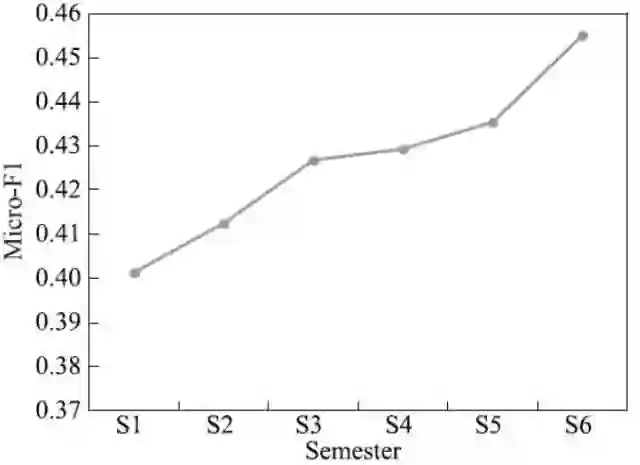 而在分别使用专业技能、规律性以及读书兴趣作为输入特征,依次使用六个学期的数据进行实验时,结果表明越接近毕业精度越高。