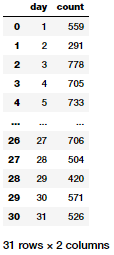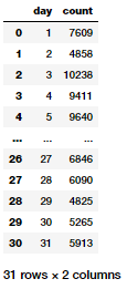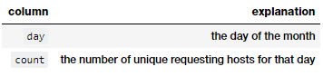 我们希望 DataFrame 中数据按照日期的升序排序,其中包括天和与那一天关联的不同主机的数量。