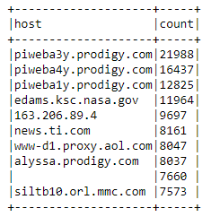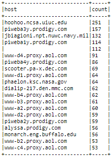 使用只包含 404 响应代码的日志记录 DataFrame,我们现在将打印出产生最多 404 错误的前 20 个主机的列表。记住,这些主机应该是按顺序排列的。