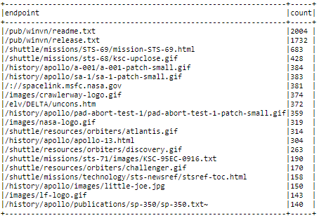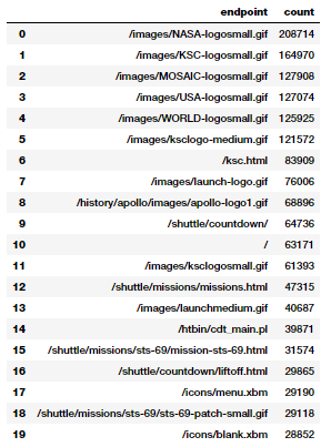 使用只包含 404 响应代码的日志记录 DataFrame,我们现在将打印出产生最多 404 错误的前 20 个端点的列表。记住,这些端点应该是有序的。