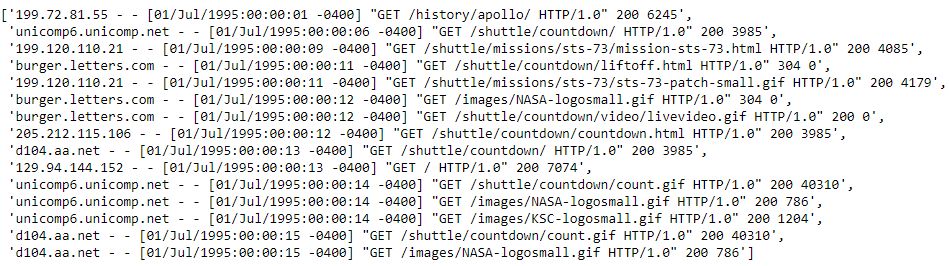 ['01/Jul/1995:00:00:01 -0400','01/Jul/1995:00:00:06 -0400','01/Jul/1995:00:00:09 -0400',...,...,' 01/Jul/1995:00:00:14 -0400','01/Jul/1995:00:00:15 -0400','01/Jul/1995:00:00:15 -0400']