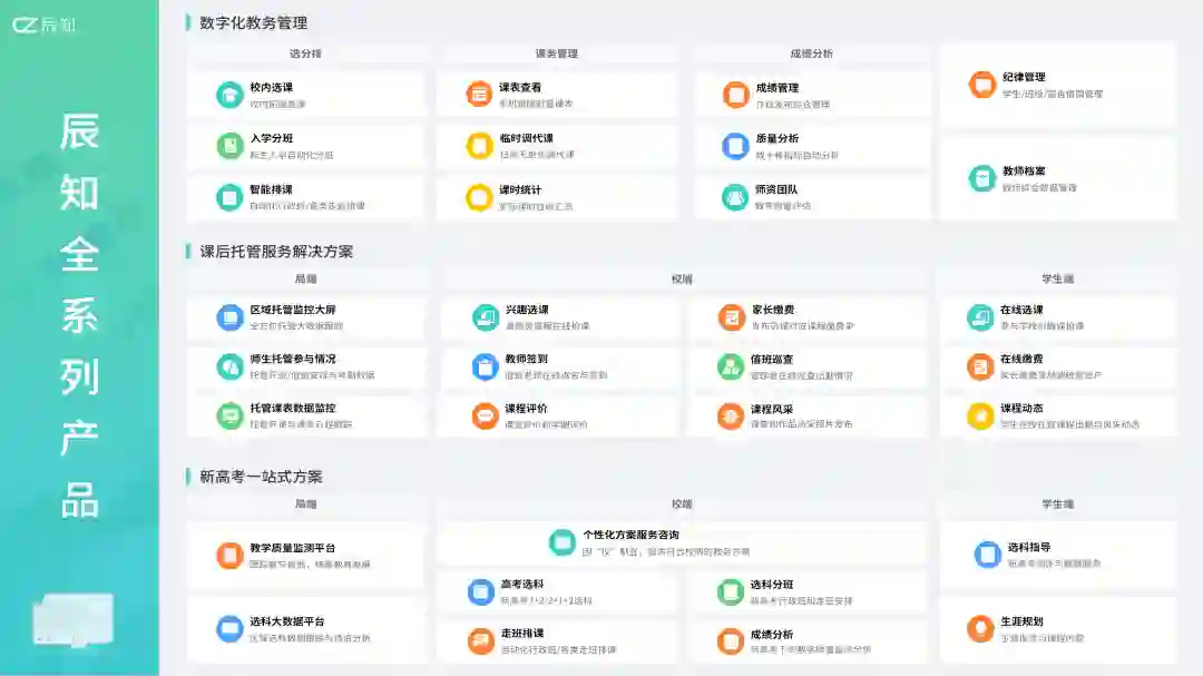 辰知科技作为新高改背景下成立的校园信息化SaaS解决方案服务商,以教务管理和新高考为切入点,面向区域局和大型学校提供各类场景的解决方案,如选课、分班排课、考试安排、课后延时服务等。