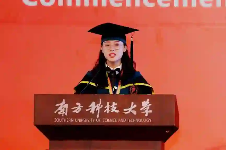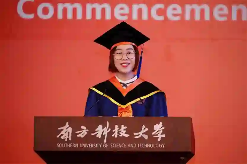 来自树德书院的2018届材料与科学工程系毕业生郭恬子代表全体本科毕业生发言。她从“为什么选择南科大”谈起,回顾了自己的科研创业梦在南科大这篇沃土中从滋生到开花结果的过程,她认为,正是南科大多元价值的土壤,涵养了学子们对于人生的不同选择。