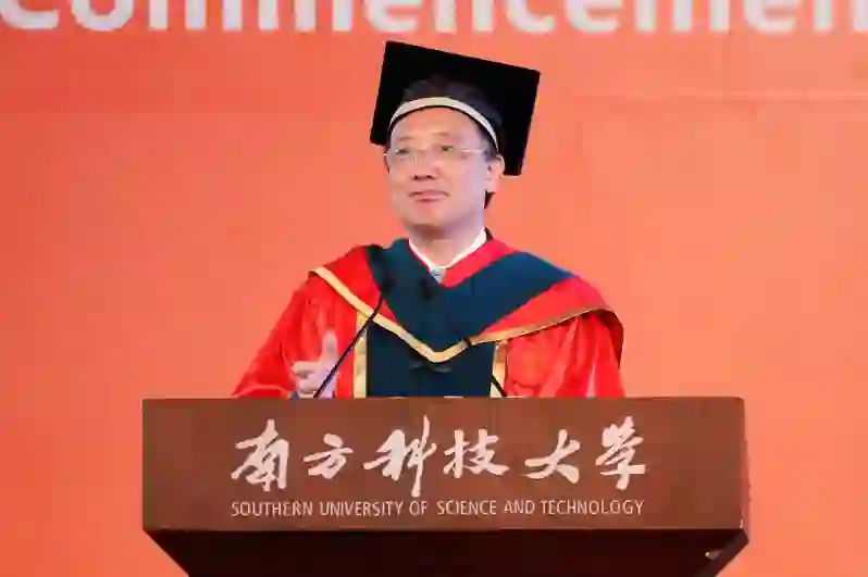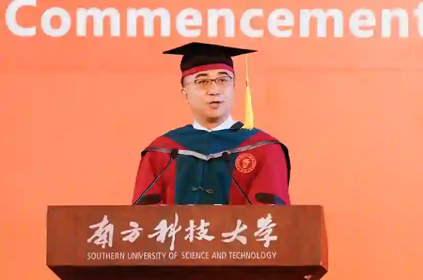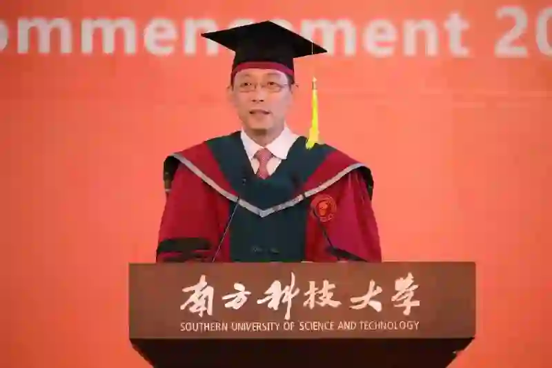 特邀嘉宾施一公院士致辞。他首先祝贺同学们跨越了人生马拉松征程中最为重要的一个转折点并将开启人生新的一页。他介绍了西湖大学的诞生过程和创办进程,表示西湖大学紧随着高等教育改革先驱之一的南方科技大学,携手踏上新征程,希望两所办学模式各有特色但心心相通的兄弟学校在未来同行的路上守望相助,共创辉煌。施一公认为,改革、创新、逐梦,是南科大留给毕业生与众不同的印记,而这种与众不同正源于他们四年前的选择,源于他们勇于放弃其他名校,选择年轻的南科大一路探索前行,追随心中梦想。他寄语同学们不论未来遇到何种挑战,都要始终保持着当初选择南科大时候的初心与勇气,战胜困难、笑容灿烂。