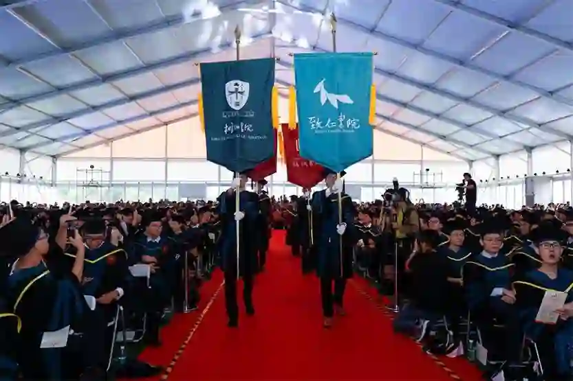伴随着庄严的乐曲声,四名旗手在致仁书院院长徐保民、树仁书院院长黄立民、致诚书院院长夏志宏、树德书院院长郑春苗的陪同下,高举书院院旗,昂首阔步走进会场。四周掌声响起,点燃了现场的气氛。随后,郭雨蓉、陈十一和嘉宾、导师们在全场的瞩目和掌声中入场。