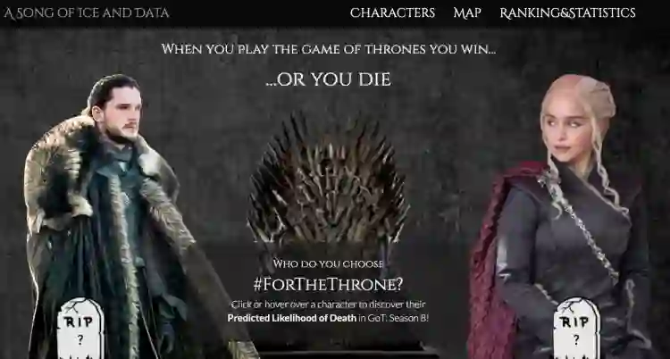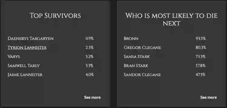 结果被直观地展现在专门为此制作的网站上。截至目前,主要角色中存活率最高的前三位分别是丹妮莉丝·坦格利安(死亡概率0.9%,下同)、提利昂·兰尼斯特(2.5%)和瓦里斯(3.2%)。