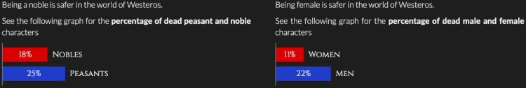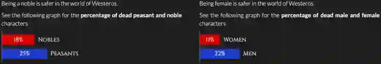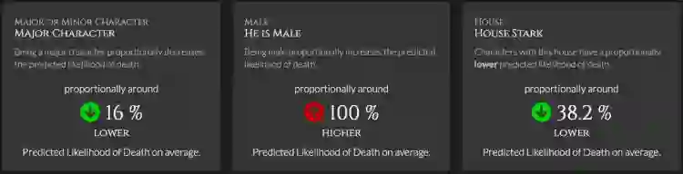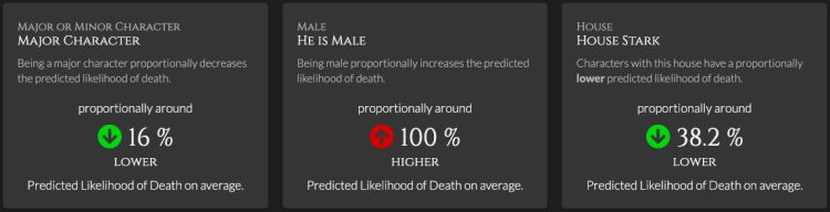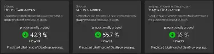 在每个角色的对应页面,都展示了更细致的数据分析。诸如性别为何、是否是贵族出身、属于哪个家族、是否是主要角色、是否结婚等等,都成为一个角色存活率的影响因素。