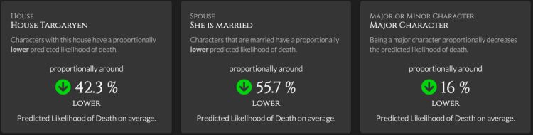 比如龙妈的主页显示,她是一个已婚人士,因而其死亡概率降低了55.7%;因为是坦格利安家族后裔,概率降低了42.3%;因为是主要人物,概率又降低了16%。